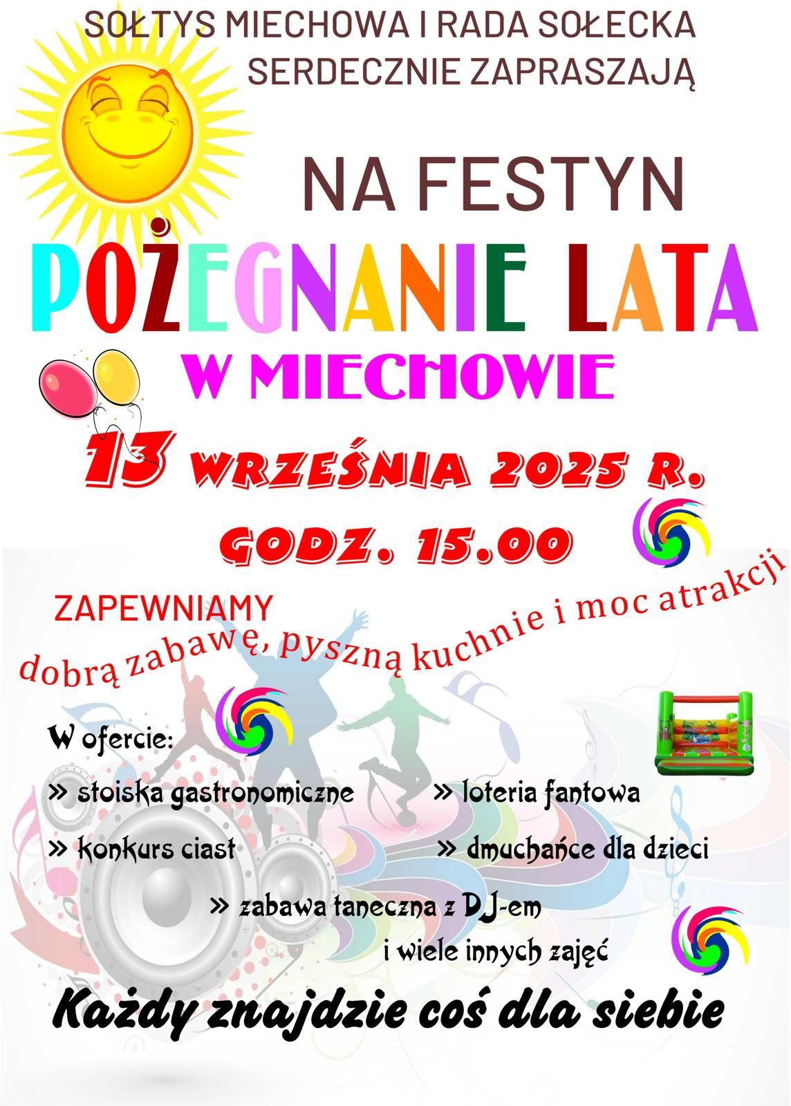 Sołtys Miechowa i Rada Sołecka zapraszają na wspólne pożegnanie lata! Już 13 września 2025 r. od godziny 15:00 czeka moc atrakcji – stoiska gastronomiczne, konkurs ciast, loteria fantowa, dmuchańce dla dzieci oraz zabawa taneczna z DJ-em.