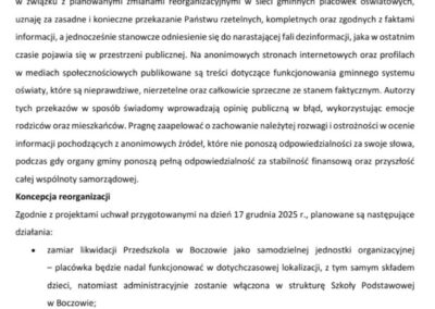 W dokumencie wskazano zamiar likwidacji przedszkola w Boczowie jako samodzielnej jednostki organizacyjnej przy jednoczesnym zachowaniu jego funkcjonowania w dotychczasowej lokalizacji. Oświadczenie odnosi się także do planowanej likwidacji przedszkola i szkoły w Gądkowie Wielkim oraz przekształcenia szkoły w Walewicach.