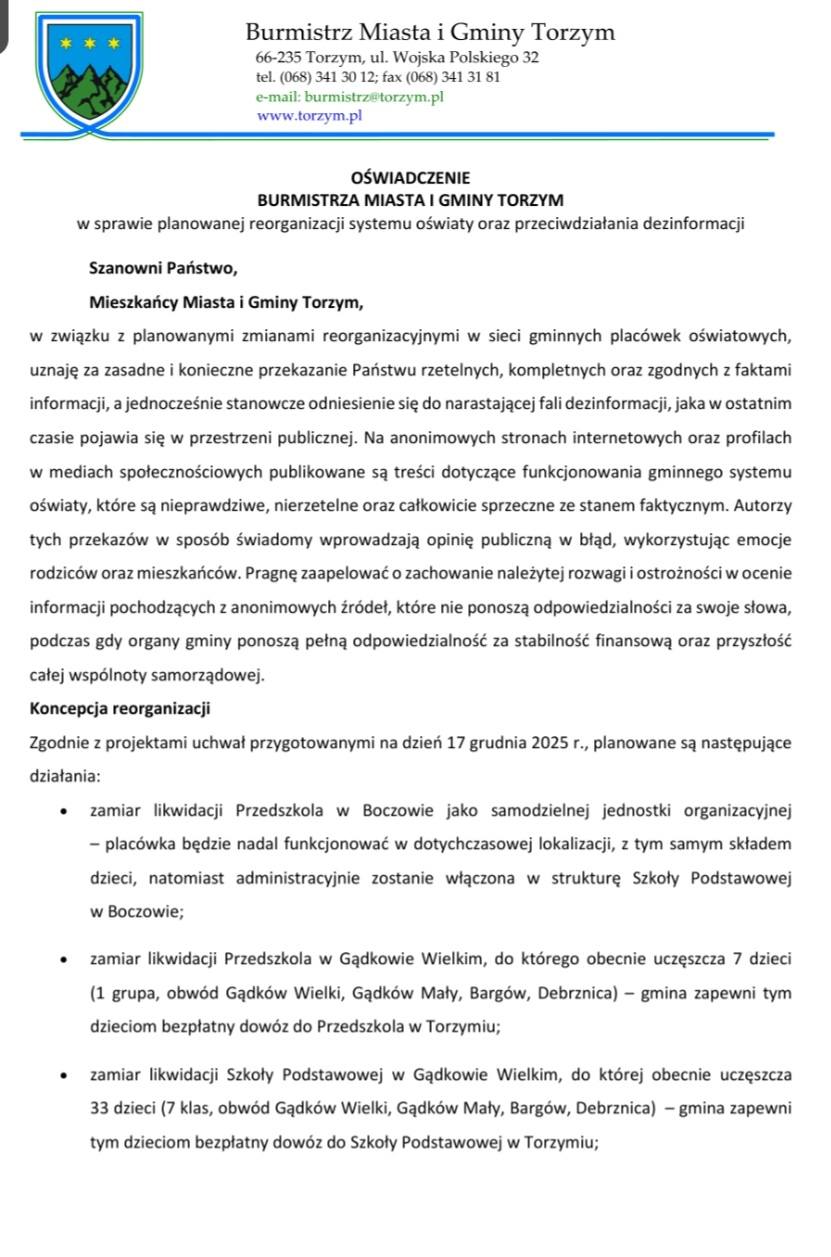 Burmistrz Miasta i Gminy Torzym Ewelina Niwald-Brzuśnian opublikowała oświadczenie dotyczące reorganizacji systemu oświaty w gminie. Zmiany mogą dotyczyć m.in. przedszkola w Boczowie oraz placówek w Gądkowie Wielkim i Walewicach.