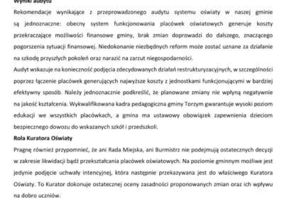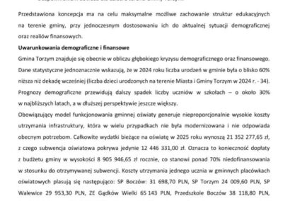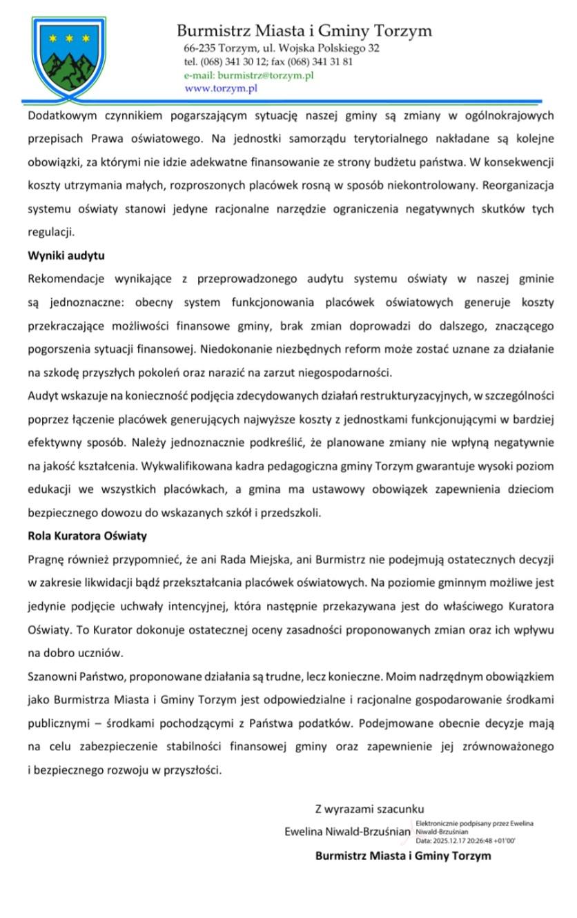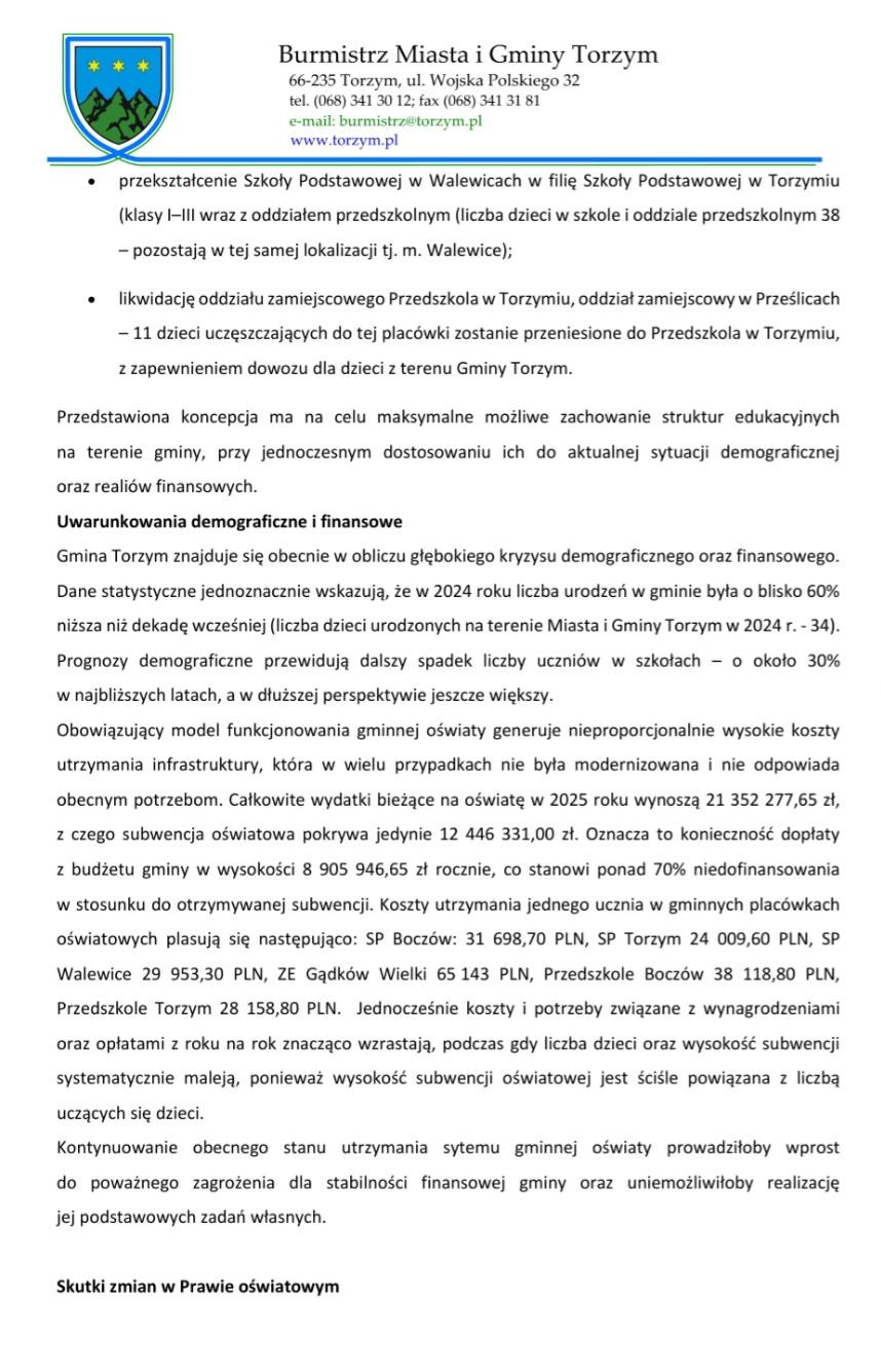 Jak podkreśla burmistrz, obecny model funkcjonowania oświaty generuje koszty przekraczające możliwości finansowe gminy. Na sytuację wpływają spadek liczby dzieci, rosnące koszty utrzymania placówek oraz niedostateczne finansowanie z budżetu państwa. Jednocześnie zaznaczono, że gmina ma obowiązek zapewnienia ciągłości edukacji i dowozu dzieci, a ostateczne decyzje w sprawie likwidacji lub przekształceń należą do Kuratora Oświaty.