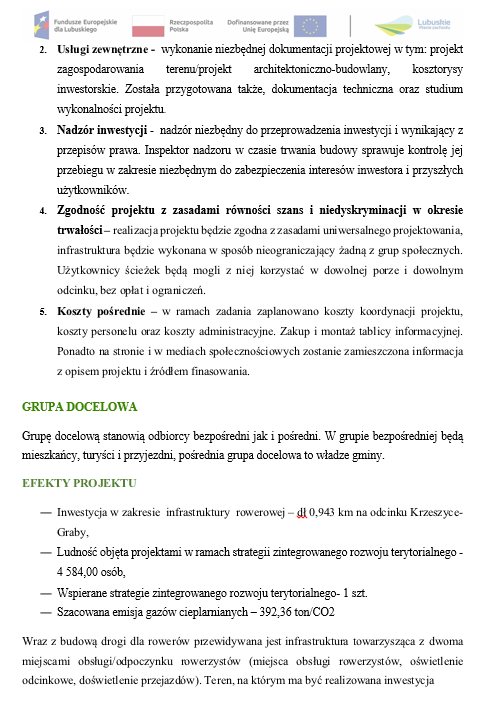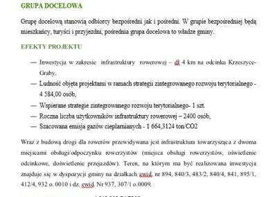 W ramach I etapu powstanie odcinek o długości 0,943 km o wartości 1 482 410,98 zł, z czego 1 225 580,50 zł pochodzi z Europejskiego Funduszu Rozwoju Regionalnego. Drugi etap to kolejna część trasy o długości 4 km, warta 4 548 809,74 zł, przy unijnym wsparciu 2 225 851,39 zł. Po zakończeniu inwestycji mieszkańcy zyskają spójne, bezpieczne połączenie rowerowe między miejscowościami i lepszy dostęp do ekologicznego transportu.