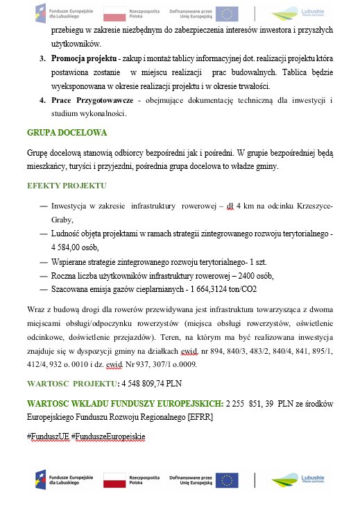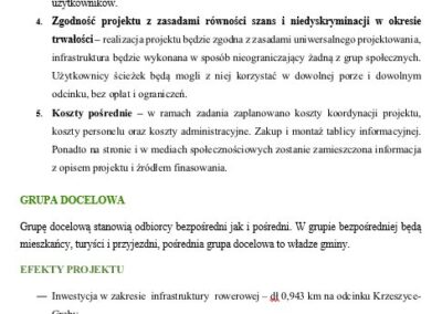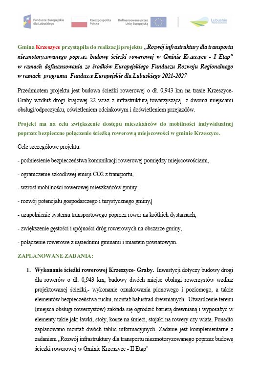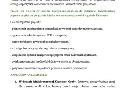 Projekt Rozwój infrastruktury dla transportu niezmotoryzowanego poprzez budowę ścieżki rowerowej w Gminie Krzeszyce – I i II etap ma na celu poprawę bezpieczeństwa i mobilności mieszkańców oraz ograniczenie emisji CO₂. Inwestycja obejmie budowę drogi rowerowej z oświetleniem, oznakowaniem oraz dwoma miejscami obsługi rowerzystów wyposażonymi w ławki, stojaki, stoły, wiaty i kosze.