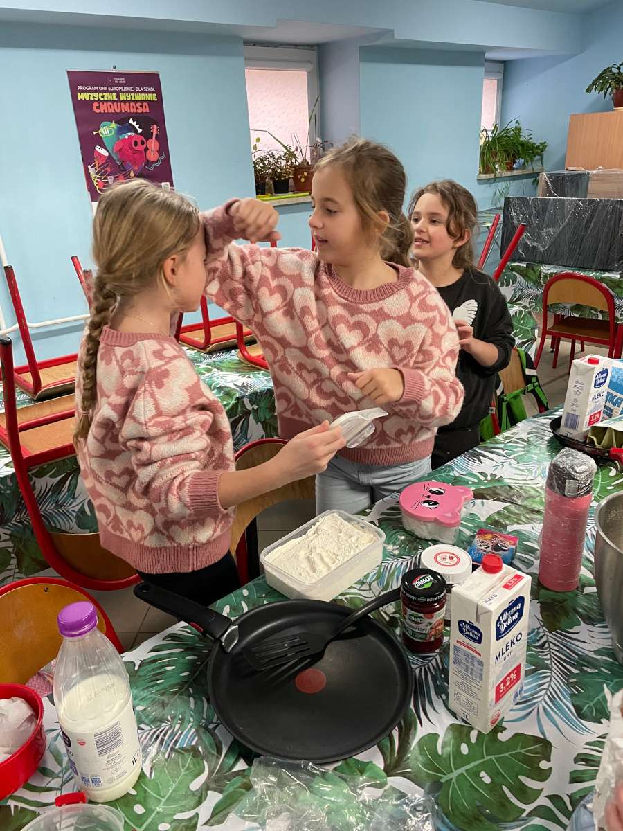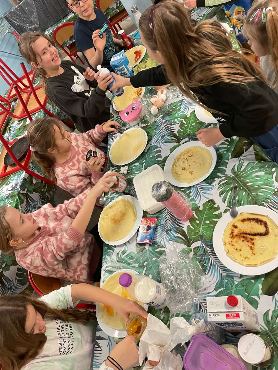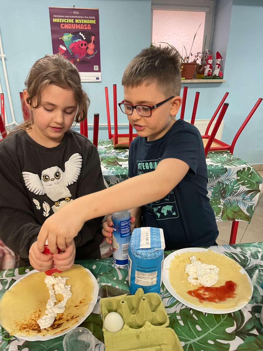 Uczniowie poznali tradycję związaną z Shrove Tuesday czyli Pancake Day. Święto to było doskonałą okazją, by najmłodsi uczniowie naszej szkoły poznali nazwy produktów spożywczych oraz kuchennego sprzętu. Uczniowie klasy III Szkoły Podstawowej w Wędrzynie wspólnie stworzyli przepis na najlepsze ciasto naleśnikowe oraz udekorowali przygotowane przez siebie wypieki.