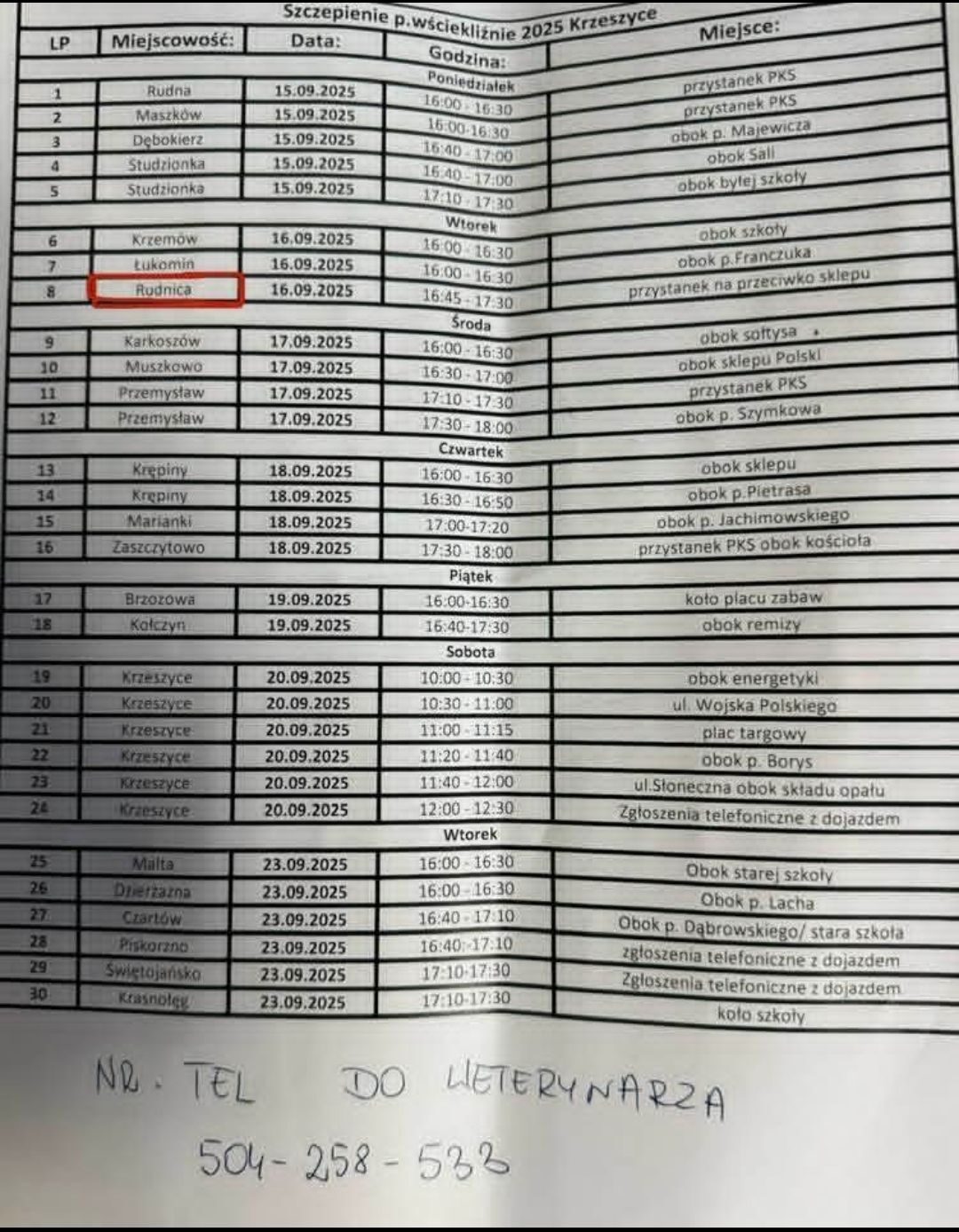 Lekarz weterynarii odwiedzi miejscowości w gminie zgodnie z harmonogramem zamieszczonym poniżej. W razie pytań lub potrzeby uzyskania dodatkowych informacji można kontaktować się z lekarzem pod numerem telefonu 504 258 533.